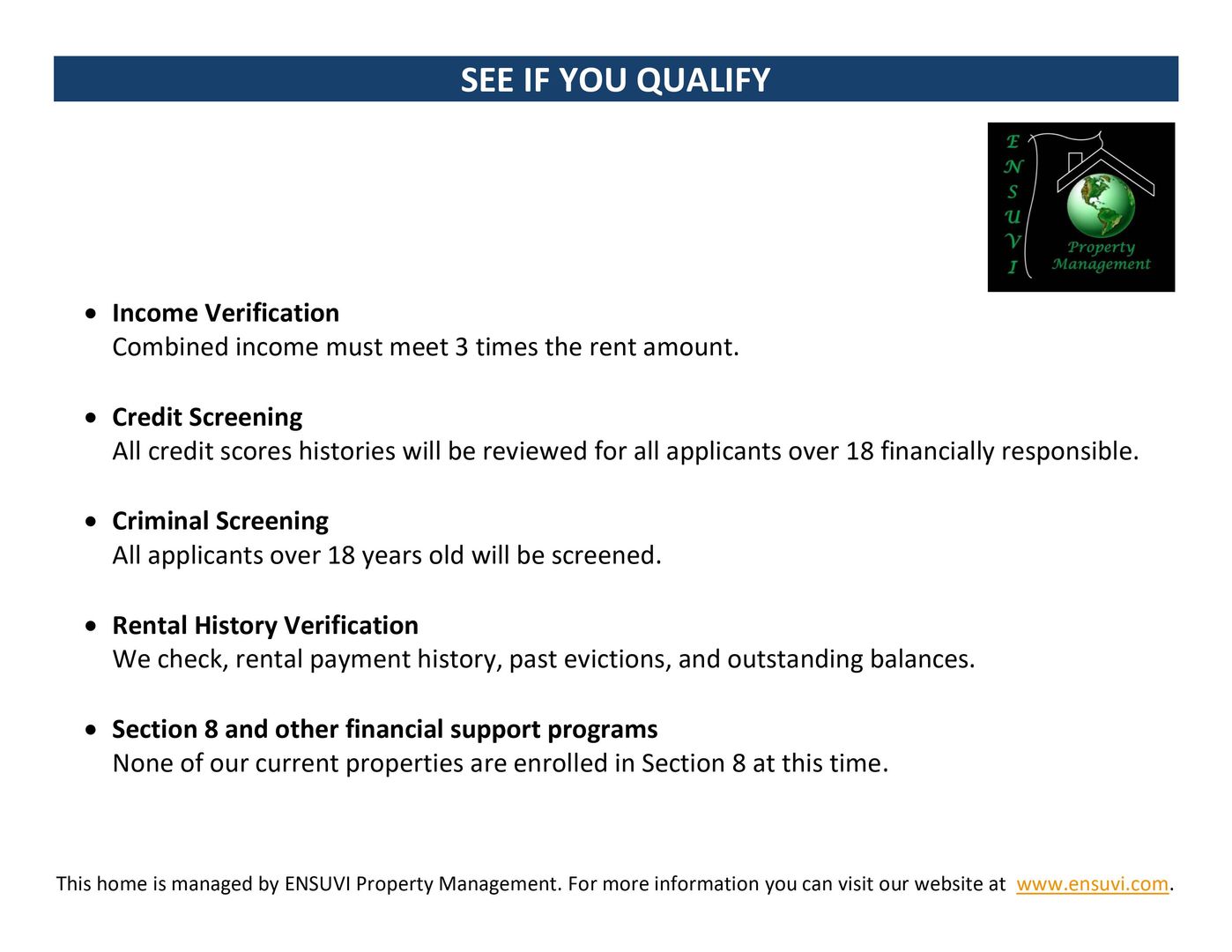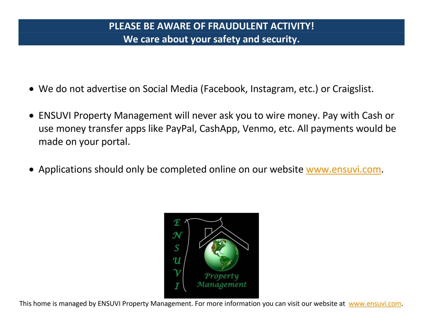 If you have any questions or would like to schedule a viewing, please send a message through this website. If you would like to apply, please go to our available listings at www.ensuvi.com. Our business hours are Monday through Friday from 9:00 to 5:00 PM Closed Holidays.